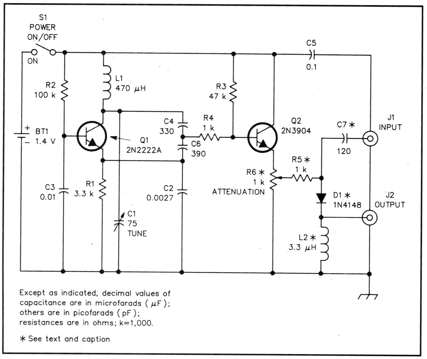 Most hams will find the 500-kHz frequency offset convenient, but the oscillator can be tuned to other frequencies.[Notes from VK3VT - with the components shown my unit came out around 1MHz which works well.] If VHF/UHF activity is high in your area, choose an oscillator frequency that creates mixing products in clear portions of the band. The attenuator was designed for 144-MHz RDF, but will work elsewhere in the VHF/UHF range. [Has been used successfully on 50MHz, 144MHz, 440MHz and 1296MHz]